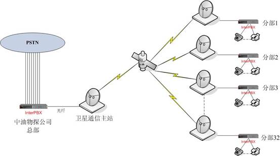 中油物探公司為中國(guó)石油公司下屬公司,下屬共有32個(gè)分部,分部集中在西部地區(qū)通訊及網(wǎng)絡(luò)均不健全,所以本方案采用衛(wèi)星通信為物理鏈路基礎(chǔ),采用北京正有VOIP系統(tǒng)的方式與總部之間進(jìn)行話務(wù)聯(lián)系。