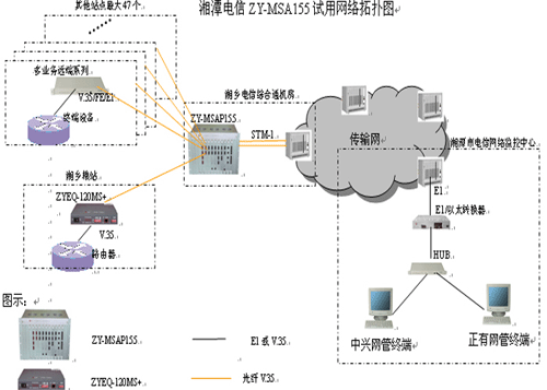 北京正有公司的ZY-MSAP155作為接入設備,上聯到由華為公司構建的本地傳輸網上,接口為155M的(STM-1)SDH光接口,其中局端設備ZY-MSAP155安裝在湘鄉電信綜合機房(與華為公司傳輸設備同機房),遠端設備ZYEQ-120MS+安裝在湘鄉糧站,通過光纜和局端設備相連。網管終端安裝在湘潭市電信網絡監控中心,與被管理設備距離30公里,通過傳輸網的2M通道建立網管鏈路,實現異地管理。