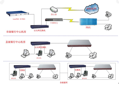 銀行系統及各區縣分行都已經建設有自己的網絡以及通信系統。為了滿足當前銀行系統與各區縣分行間因為工作而日益發展的通信需求,我公司建議在現有的數據網絡上利用VoIP技術來實現語音通信業務。在國家政策的層面上,我國將IP電話歸類為電信增值業務,不必承擔電信運營商所受的管制規定。技術層面上,隨著數字信號處理器和集成電路生產技術變得非常成熟,IP傳輸技術在實時性和服務質量方面得到了長足發展,VoIP產品在很低的帶寬下,就可以保證語音應用的實時性和通話質量。